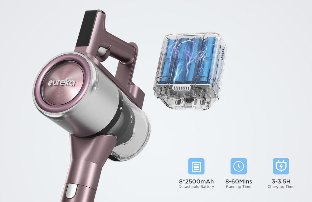 Výdrž baterie až 60 minut pro ruční vysavač v nízkém režimu, 8 * 2500mAh velkokapacitní baterie, dlouhá doba čištění, snadné hluboké čištění celého domu.